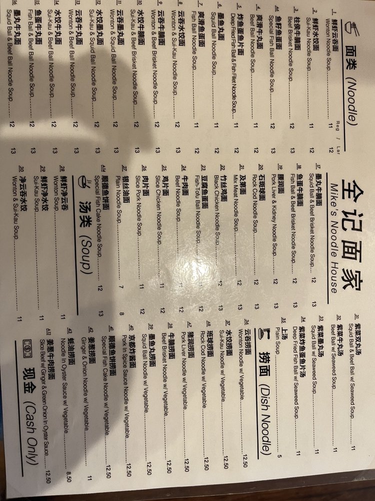 Mike’s Noodle House in Seattle's International District offers an authentic Cantonese noodle experience. Specializing in a variety of noodle and congee dishes, this cozy spot provides a casual atmosphere perfect for a quick lunch or dinner. The menu boasts options like Wonton Noodle with Vegetable, Beef Brisket Noodle, and Rock Cod Congee, all crafted with traditional flavors and high-quality ingredients. The handmade fish balls and fish cakes are a standout, offering a bouncy texture and exceptional taste. A must-try is the Pork Liver Noodle with Vegetable, known for its light yet flavorful broth. With fast service, generous portions, and a homey vibe, Mike’s Noodle House is a gem for those craving delicious and satisfying noodle dishes. Don't forget, it's cash only, so come prepared to indulge in these delectable creations.
